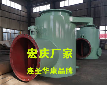 4、分匯器是一個三通閥,通過導向板的切換可使膠球進入需要清洗的一側凝汽器中工作。一般一臺機組需兩臺分匯器,其進口通徑為DN100,分配口為DN89,膠球投用時可通過窺視窗觀察運行情況。FH型分匯器(清潔海綿膠球切換三通管閥)
